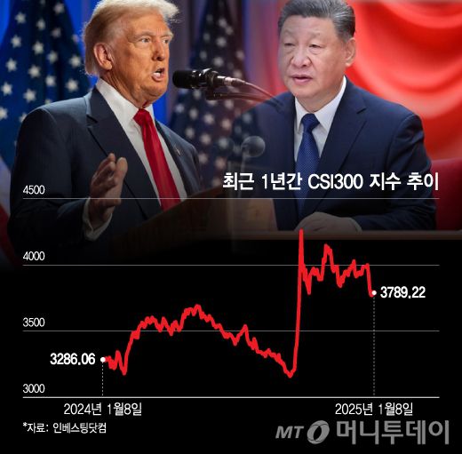 최근 중국 증시가 약세를 보이는 이유는 오는 20일 예정된 트럼프 행정부의 취임 영향으로 풀이된다. 트럼프 당선인이 예고한 관세가 현실화되면 중국 수출이 크게 위축될 것으로 예상돼서다. 시장은 트럼프 1기 당시처럼 미중 무역 분쟁이 재개되는 상황을 우려하고 있다.