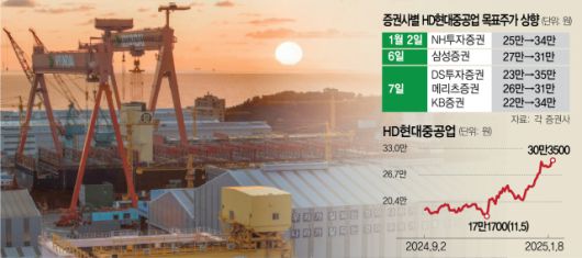 지난해 11월 “미 조선업에 한국의 도움이 필요하다”는 도널드 트럼프 미국 대통령 당선인의 발언으로 촉발된 조선주 랠리는 최근 증권사들이 목표 주가를 상향하면서 더욱 힘을 받는 분위기다. KB증권은 전날 HD현대중공업의 목표가를 각각 22만 원에서 34만 원으로 54.55% 대폭 상향 조정했다. 같은 날 메리츠증권과 DS투자증권 역시 HD현대중공업의 목표가를 각각 26만 원에서 31만 원으로, 23만 원에서 35만 원으로 크게 높였다. 지난해 신규 수주액이 108억 5000만 달러로 목표치인 95억 3000만 달러를 훌쩍 초과 달성해 4분기 실적 발표에서 어닝 서프라이즈(깜짝 실적)를 보일 것이라는 게 증권사들의 공통된 의견이었다.