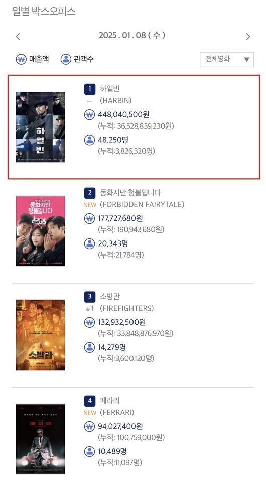 '하얼빈'은 '동화지만 청불입니다', '페라리', '보고타: 마지막 기회의 땅'을 제치고 박스오피스 1위 및 전체 예매율 1위를 수성해 장기 흥행 청신호를 켰다. 팬데믹 이후 변화된 흥행 패턴에 따라 '하얼빈'은 기존 관객들의 신뢰도 있는 입소문에 힘입어 구정 연휴 까지도 굳건한 흥행 기세를 보여줄 것으로 보인다.