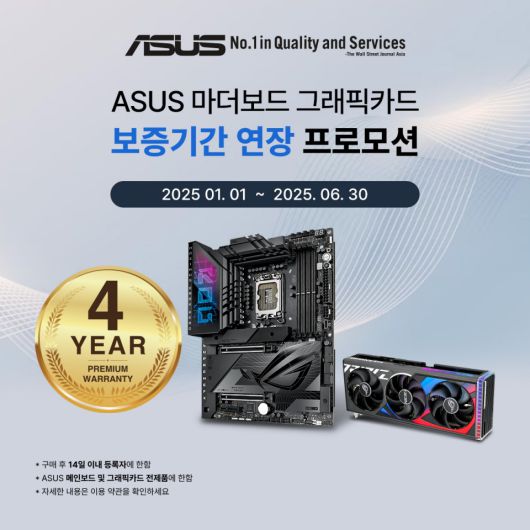 [디지털포스트(PC사랑)=임병선 기자] ASUS 코리아(지사장: David Fu, 이하 에이수스)는 메인보드 및 그래픽카드 제품에 대해 기존 3년에 추가 1년의 보증기간을 연장해주는 프로모션을 2025년에 진행함을 밝혔다.