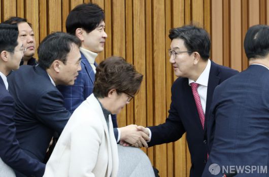 [서울=뉴스핌] 정일구 기자 = 권성동 국민의힘 원내대표가 10일 오전 서울 여의도 국회에서 열린 원내대책회의에서 참석 의원들과 인사하고 있다. 2025.01.10 mironj19@newspim.com