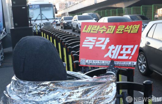 [서울=뉴스핌] 이호형 기자 = 고위공직자범죄수사처의 윤석열 대통령에 대한 체포 영장이 재발부 된 가운데 10일 오전 서울 용산구 한남동 대통령 관저 인근에서 한 집회 참가자가 통행 차량을 향해 손피켓을 보이고 있다.2025.01.10 leemario@newspim.com