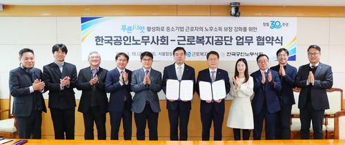 ▲ 근로복지공단은 10일 서울합동청사에서 한국공인노무사회와 중소기업퇴직연금기금제도인 '푸른 씨앗' 가입 확산 업무협약을 맺었다. 양측은 협약을 통해 푸른 씨앗을 적극적으로 홍보하고, 푸른 씨앗의 발전을 위해 다양한 협력 방안을 모색하기로 했다. 푸른 씨앗 가입을 희망하는 30인 이하 사업장은 근로복지공단 고객센터(☎ 1661-0075) 또는 푸른 씨앗 전용 홈페이지에서 가입할 수 있다. (서울=연합뉴스)