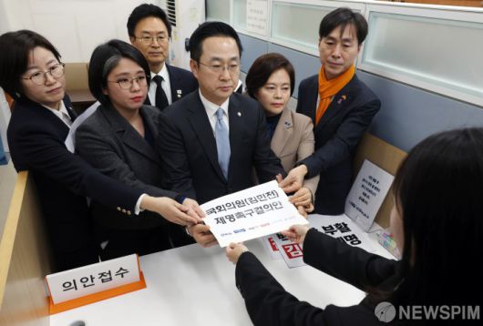 더불어민주당 박성준 원내수석부대표와 정진욱 의원, 정춘생 조국혁신당 의원, 정혜경 진보당 의원, 용혜인 기본소득당 대표, 한창민 사회민주당 대표가 10일 서울 여의도 국회 의안과에서 김민전 국민의힘 의원 제명촉구 결의안을 제출하고 있다. 2025.01.10. |