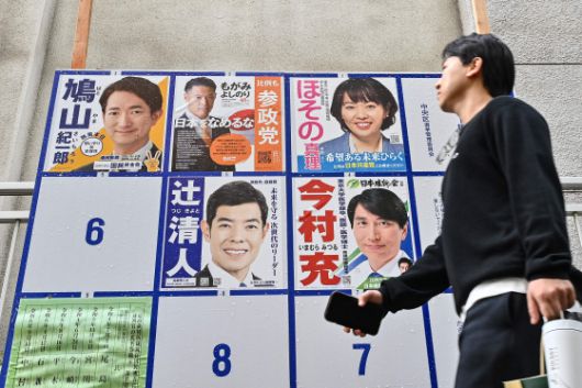 한 시민이 지난해 10월 일본 중의원 선거를 앞두고 선거 벽보 앞을 지나가고 있다. AFP=연합뉴스 |