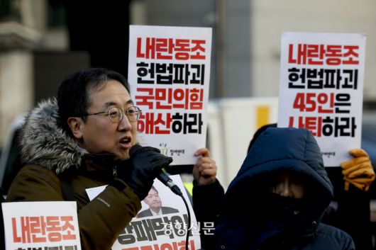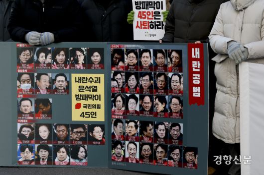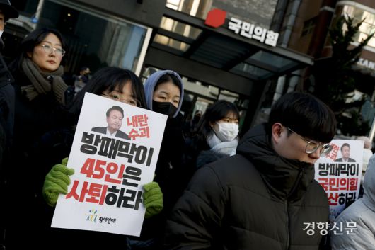이들은 “국민의힘은 법원이 적법하게 발부한 체포영장을 불법이라고 우기더니 급기야 영장 집행을 막겠다며 국민의힘 의원 45명이나 관저 앞으로 달려갔다”며 “연일 극우세력을 선전·선동하며 윤석열 친위대를 자처하고 법치주의를 부정하고 있다”고 주장했다.