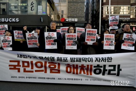 국민의힘 국회의원 45명이 윤석열 대통령 체포영장 집행을 막기 위해 지난 6일 대통령 관저 앞에 모인 것에 대해 시민사회단체가 “내란수괴의 인간방패”라고 비판하며 의원직 사퇴를 촉구했다.