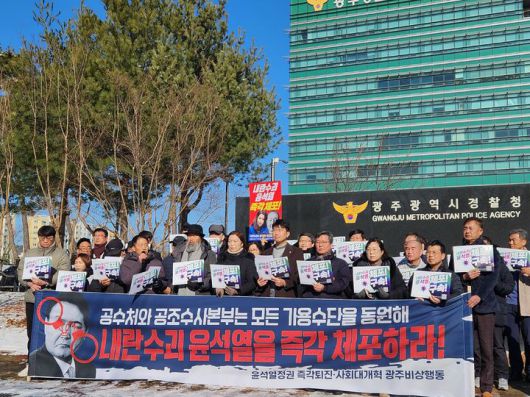 [광주=뉴시스]김혜인 기자 = 광주시민사회단체가 고위공직자범죄수사처(이하 공수처)를 향해 모든 가용 수단을 동원해 윤석열 대통령과 비호 세력을 즉각 체포하라고 촉구했다.