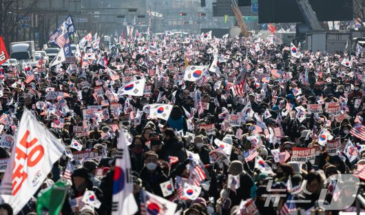 (서울=뉴스1) 이승배 기자 = 자유통일당·대한민국바로세우기국민운동본부 구성원들이 11일 오후 서울 세종대로 네거리 인근에서 윤석열 대통령 탄핵 반대 집회를 하고 있다. 2025.1.11/뉴스1