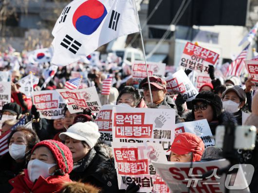 (서울=뉴스1) 오대일 기자 = 공수처와 경찰의 윤석열 대통령 2차 체포영장 집행 시도가 임박한 가운데 11일 오후 서울 용산구 한남동 대통령 관저 인근에서 열린 탄핵 반대 집회에서 윤석열 대통령 지지자들이 피켓을 들고 구호를 외치고 있다. 2025.1.11/뉴스1