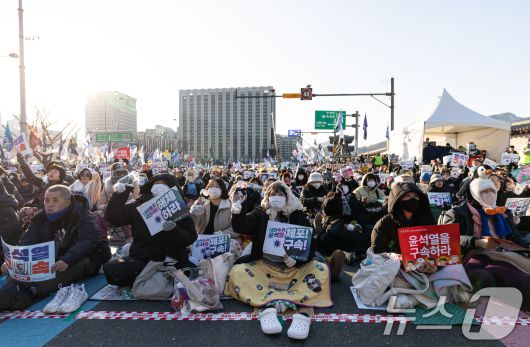 (서울=뉴스1) 이승배 기자 = 11일 오후 서울 종로구 광화문 인근에서 열린 윤석열 즉각퇴진 사회대개혁 비상행동 6차 시민대행진에서 참가자들이 윤석열 대통령 퇴진 등을 촉구하고 있다. 2025.1.11/뉴스1photolee@news1.krCopyright ⓒ 뉴스1. All rights reserved. 무단 전재 및 재배포, AI학습 이용 금지.