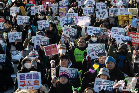 (서울=뉴스1) 이승배 기자 = 11일 오후 서울 종로구 광화문 인근에서 열린 윤석열 즉각퇴진 사회대개혁 비상행동 6차 시민대행진에서 참가자들이 윤석열 대통령 퇴진 등을 촉구하고 있다. 2025.1.11/뉴스1