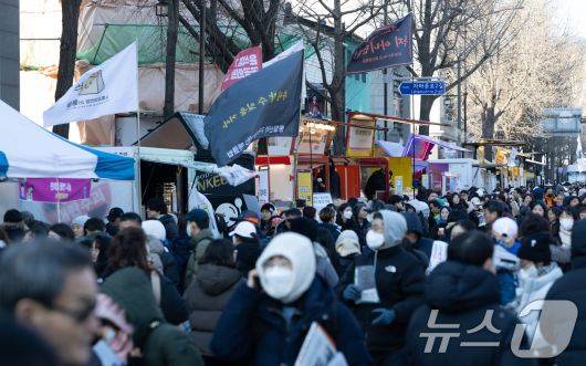 (서울=뉴스1) 이승배 기자 = 윤석열 즉각퇴진 사회대개혁 비상행동 6차 시민대행진이 진행된 11일 서울 경복궁역 인근에 무료 나눔 푸드트럭 구역이 마련돼 있다. 2025.1.11/뉴스1photolee@news1.krCopyright ⓒ 뉴스1. All rights reserved. 무단 전재 및 재배포, AI학습 이용 금지.