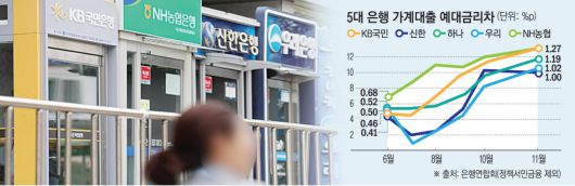 은행연합회 소비자 포털에 공시된 '예대금리차 비교' 통계에 따르면 지난해 11월 5대 은행에서 취급된 가계대출의 예대금리차(정책서민금융 제외)는 1.00∼1.27%p로 집계됐다. 5대 은행의 가계 예대금리차가 모두 1%p를 넘어선 것은 2023년 3월 이후 1년 8개월 만에 처음이다.