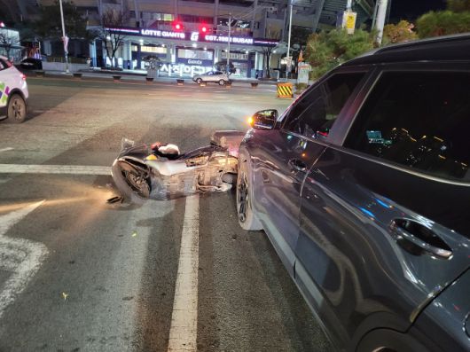 10일 오후 7시 20분쯤 부산 동래구 사직동의 한 교차로에서 음주운전을 하던 60대가 사고를 내고 달아나다 또 다시 사고를 냈다. 부산경찰청 제공 |