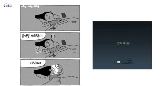 민형배 더불어민주당 의원이 지난 10일 국회 문화체육관광위원회 전체회의에서 소개한 내란성 불면증을 다룬 세컷 만화. 국회 의사중계 갈무리 |
