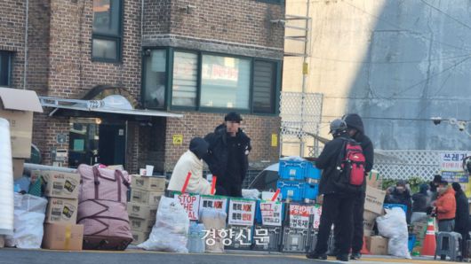 윤석열 대통령 탄핵 반대 집회 참석자들이 12일 오전 서울 한남초등학교 정문 맞은편에 후원 물품을 분류해 쌓아두고 있다. 강한들 기자 |