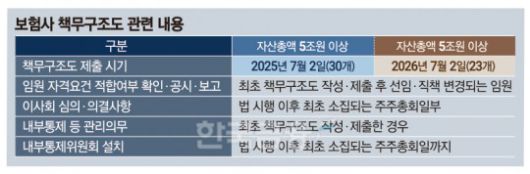 금융지주와 은행권은 지난 3일부터 책무구조도가 공식 시행됐지만 보험업권은 자산 5조원 이상 보험사들은 올해 7월에, 5조원 미만인 보험사들은 2026년 7월에 책무구조도가 시행된다.