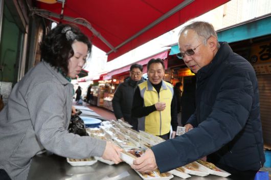 류진 한국경제인협회 회장이 지난 7일 서울 영등포구 우리시장을 찾아 전을 구매하고 있다. 한경협 제공 |