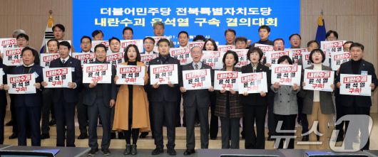 (전주=뉴스1) 유경석 기자 = 이원택 더불어민주당 전북특별자치도당위원장을 비롯한 관계자들이 13일 전북자치도 전주시 더불어민주당 전북특별자치도당 컨퍼런스룸에서 열린 '내란수괴 윤석열 구속 결의대회'에서 구호를 외치고 있다. 2025.1.13/뉴스1Yks919@news1.krCopyright ⓒ 뉴스1. All rights reserved. 무단 전재 및 재배포, AI학습 이용 금지.
