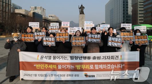 (서울=뉴스1) 임세영 기자 = 13일 오전 서울 세종대로 광화문광장에서 열린 '윤석열 물어가는 범청년행동 출범 기자회견'에서 참석자들이 구호를 외치고 있다. 2025.1.13/뉴스1