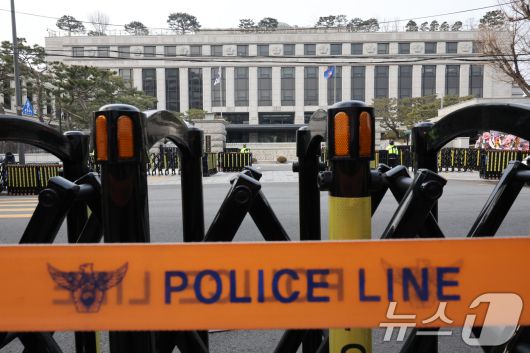 (서울=뉴스1) 송원영 기자 = 윤석열 대통령 탄핵심판 사건의 첫 변론기일이 하루 앞으로 다가온 13일 서울 종로구 헌법재판소에서 경찰들이 경계근무를 하고 있다. 윤 대통령 측이 체포영장 집행 시도에 따른 신변 안전 우려 등을 이유로 불출석 의사를 밝힌 만큼, 첫 기일은 공전이 불가피할 전망이다. 2025.1.13/뉴스1