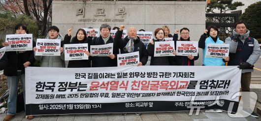 (서울=뉴스1) 김진환 기자 = 한일역사정의평화행동 회원들이 13일 서울 종로구 외교부 청사 앞에서 열린 이와야 다케시 일본 외무상 방한 규탄 기자회견에서 구호를 외치고 있다. 2025.1.13/뉴스1kwangshinQQ@news1.krCopyright ⓒ 뉴스1. All rights reserved. 무단 전재 및 재배포, AI학습 이용 금지.