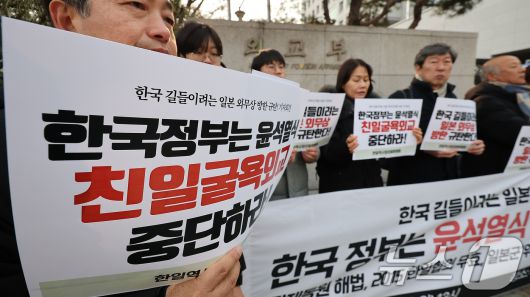 (서울=뉴스1) 김진환 기자 = 한일역사정의평화행동 회원들이 13일 서울 종로구 외교부 청사 앞에서 이와야 다케시 일본 외무상 방한 규탄 기자회견을 하고 있다. 2025.1.13/뉴스1kwangshinQQ@news1.krCopyright ⓒ 뉴스1. All rights reserved. 무단 전재 및 재배포, AI학습 이용 금지.