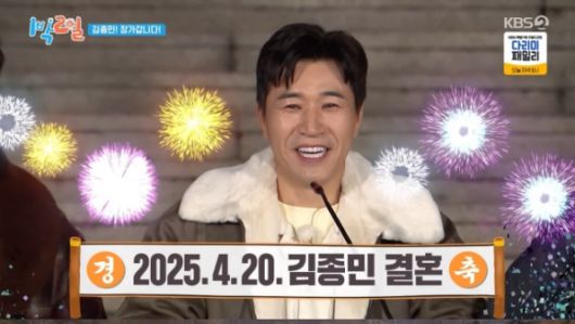 이어 2025년 첫 여행을 떠나는 '1박 2일' 팀의 이야기가 펼쳐졌다. 오프닝 장소에 홀로 모습을 드러낸 김종민은 연설대 앞에서 중대 발표를 예고했고, 멤버들이 모두 모이자 "저 김종민 장가갑니다!"라며 결혼을 공식 발표했다. 여기에 결혼식 날짜까지 최초 공개하며 멤버들로부터 뜨거운 축하를 받았다.