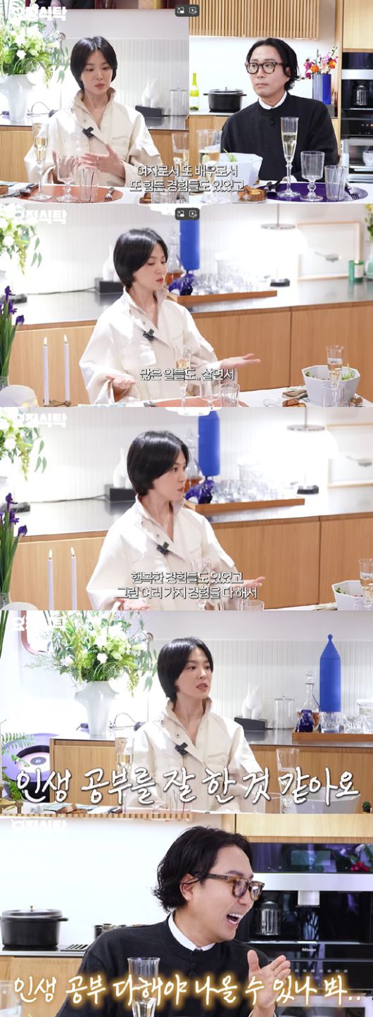 이에 송혜교는 "살면서 좋은 경험도 많이 했고 여자로서 배우로서 힘든 경험도 했다. 행복한 경험도 있었다. 여러 경험을 하면서 인생 공부를 잘 한거 같다"라며 이혼 등 자신의 개인사를 간접 언급했다.