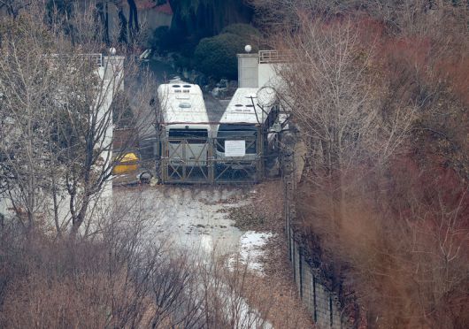 고위공직자범죄수사처(공수처)가 윤석열 대통령에 대한 체포영장을 재발부받은 지 일주일을 맞은 13일 서울 용산구 한남동 대통령 관저의 한 쪽문이 버스, 쇠사슬, 철조망으로 막혀 있다. 연합뉴스 |