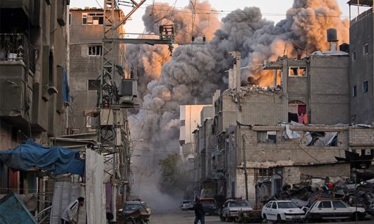 폭격 받은 난민캠프 12일(현지시간) 팔레스타인 가자지구 중부 부레이 난민캠프가 폭격을 받아 연기가 피어오르자 한 주민이 황급히 대피하고 있다. 팔레스타인 이슬람 무장정파 하마스 간 휴전 논의가 한창 진행되고 있음에도 이스라엘은 가자지구 전역을 지속적으로 폭격하고 있다. 가자지구=AFP연합뉴스 |