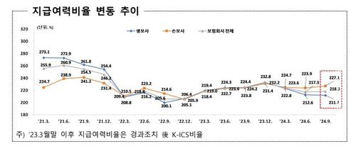 생보사 비율은 211.7%로 전 분기보다 0.9%p 하락했고, 손보사는 227.1%로 3.1%p 올랐다.
