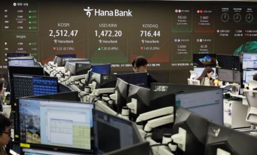 환율이 1470원을 돌파한 13일 서울 중구 하나은행 딜링룸 직원들이 업무를 보고 있다. 조용준 기자 |