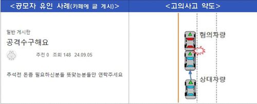 조사 결과 보험사기 알선 혐의자 3명은 다음카페 고액 알바 사이트에 '공격수 구합니다'는 글을 게시해 공모자 5명을 모집, 고의로 후미추돌사고를 야기하는 등 모두 12건의 자동차 고의사고를 야기한 혐의를 받고 있다.