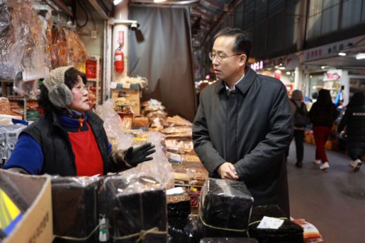 이형일 통계청장이 9일 설 명절을 앞두고 서울 남구로시장을 방문해 물가상황을 점검하고 상인들의 애로사항을 청취하고 있다./사진제공=통계청 |