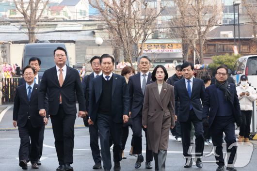(서울=뉴스1) 김명섭 기자 = 윤석열 대통령의 탄핵심판 첫 변론기일인 14일 오후 정청래 단장 등 탄핵소추단이 서울 종로구 헌법재판소에 출석하고 있다. (공동취재) 2025.1.14/뉴스1photo@news1.krCopyright ⓒ 뉴스1. All rights reserved. 무단 전재 및 재배포, AI학습 이용 금지.