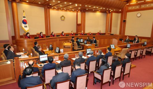 [서울=뉴스핌] 이길동기자=문형배 헌법재판소장 권한대행을 비롯한 헌법재판관들이 14일 서울 종로구 헌법재판소에서 열린 윤석열 대통령 탄핵심판 사건 첫 변론기일에 참석해 있다.2025.01.14 gdlee@newspim.com