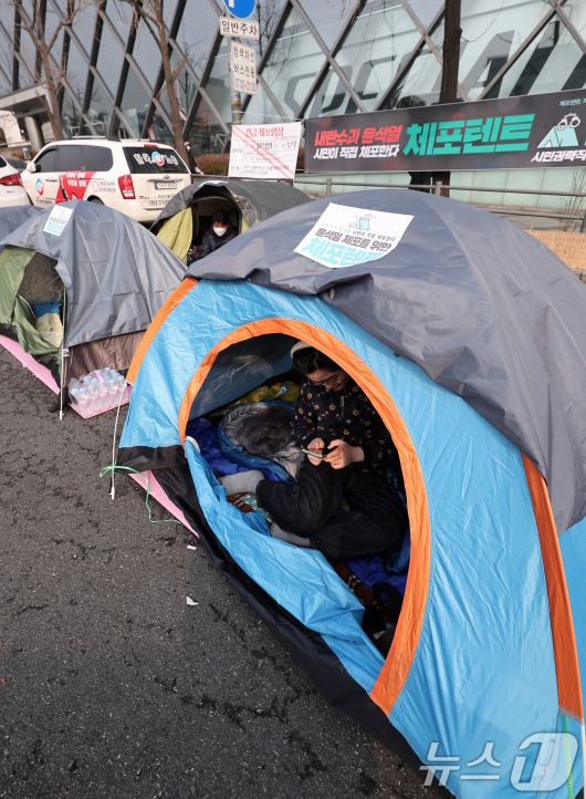 (서울=뉴스1) 김성진 기자 = 공수처와 경찰의 윤석열 대통령 2차 체포영장 집행 시도가 임박한 가운데 14일 서울 용산구 한남동 대통령 관저 인근에 설치된 체포텐트에서 시민들이 윤석열 대통령 체포 및 구속을 촉구하고 있다. 2025.1.14/뉴스1ssaji@news1.krCopyright ⓒ 뉴스1. All rights reserved. 무단 전재 및 재배포, AI학습 이용 금지.