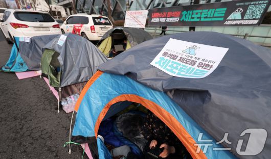 (서울=뉴스1) 김성진 기자 = 공수처와 경찰의 윤석열 대통령 2차 체포영장 집행 시도가 임박한 가운데 14일 서울 용산구 한남동 대통령 관저 인근에 설치된 체포텐트에서 시민들이 윤석열 대통령 체포 및 구속을 촉구하고 있다. 2025.1.14/뉴스1