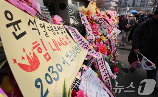 (서울=뉴스1) 김성진 기자 = 공수처와 경찰의 윤석열 대통령 2차 체포영장 집행 시도가 임박한 가운데 14일 서울 용산구 한남동 대통령 관저 인근에 윤석열 대통령을 응원하는 지지자들의 화환이 세워져 있다. 2025.1.14/뉴스1