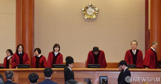[서울=뉴스핌] 이길동기자 = 윤석열 대통령 탄핵 심판의 첫 변론기일인 14일 오후 서울 종로구 헌법재판소에서 재판관들이 심판정에 앉고 있다. 2025.01.14 gdlee@newspim.com