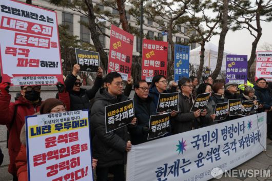 [서울=뉴스핌] 이길동기자=윤석열즉각퇴진·사회대개혁 비상행동 관계자들이 14일 서울 종로구 헌법재판소 앞에서 '내란수괴 윤석열 파면' 촉구 기자회견을 하고 있다. 2025.01.14 gdlee@newspim.com