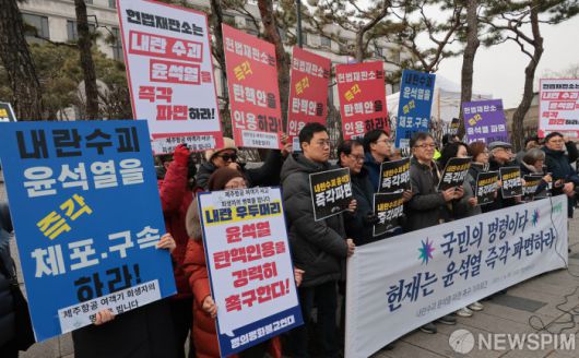 [서울=뉴스핌] 이길동기자=윤석열즉각퇴진·사회대개혁 비상행동 관계자들이 14일 서울 종로구 헌법재판소 앞에서 '내란수괴 윤석열 파면' 촉구 기자회견을 하고 있다. 2025.01.14 gdlee@newspim.com