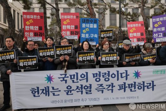 [서울=뉴스핌] 이길동기자=윤석열즉각퇴진·사회대개혁 비상행동 관계자들이 14일 서울 종로구 헌법재판소 앞에서 '내란수괴 윤석열 파면' 촉구 기자회견을 하고 있다. 2025.01.14 gdlee@newspim.com
