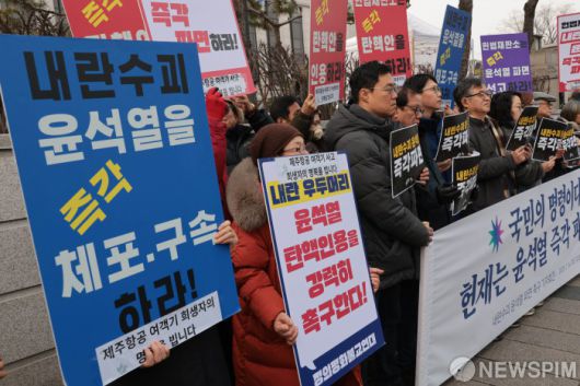 [서울=뉴스핌] 이길동기자=윤석열즉각퇴진·사회대개혁 비상행동 관계자들이 14일 서울 종로구 헌법재판소 앞에서 '내란수괴 윤석열 파면' 촉구 기자회견을 하고 있다. 2025.01.14 gdlee@newspim.com