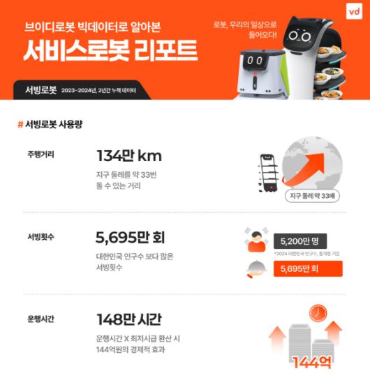 서비스로봇 전문업체 브이디컴퍼니가 최근 2년간의 운영 데이터를 분석한 '서비스로봇 리포트'를 공개했다. 회사는 서빙로봇이 지구를 33바퀴 돌 수 있는 134만km를 주행하며 5695만회의 서빙을 수행했다고 리포트를 통해 밝혔다.