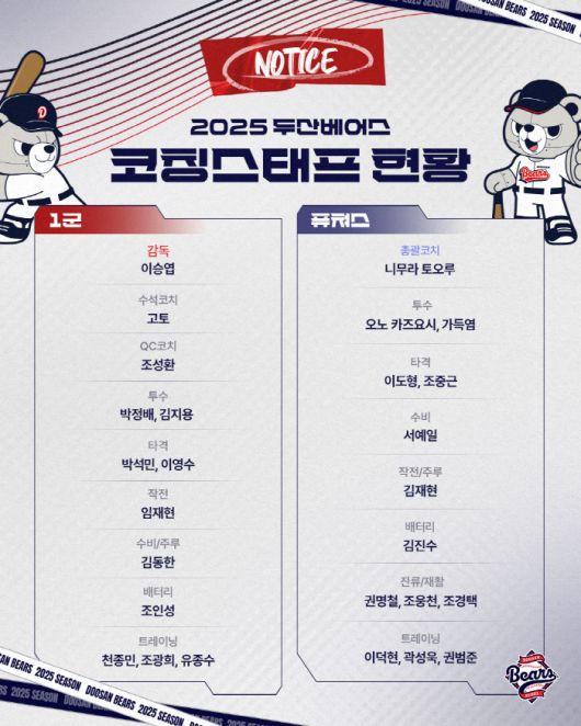 두산 베어스는 14일 2025년 코칭스태프 보직을 확정해 발표했다. 1군과 2군 모두 코치진 구성에 큰 변화가 있는데, 2군 감독 보직을 아예 없앤 게 눈에 띈다. 올해 새로 영입한 일본 출신 니무라 토오루 총괄코치가 사실상 감독 임무를 수행하는데, 코치들의 코치라는 뜻에서 총괄코치로 보직을 확정했다. 또 다른 새로운 얼굴인 오노 카즈요시 코치는 가득염 코치와 함께 투수 육성에 총력을 기울인다.