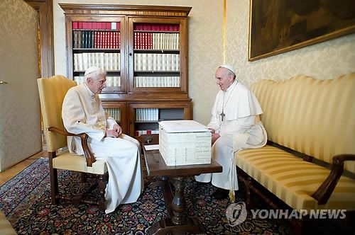 2013년 3월23일(현지시간) 프란치스코와 베네딕토 16세 사이에 흰 상자가 놓여 있다. |