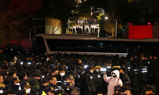 고위공직자범죄수사처와 경찰로 구성된 공조수사본부가 윤석열 대통령에 대한 2차 체포영장 집행에 돌입한 15일 오전 공수처 수사관들과 경찰 인력이 서울 용산구 한남동 대통령 관저 정문을 통과해 이동하고 있다. 뉴스1 |